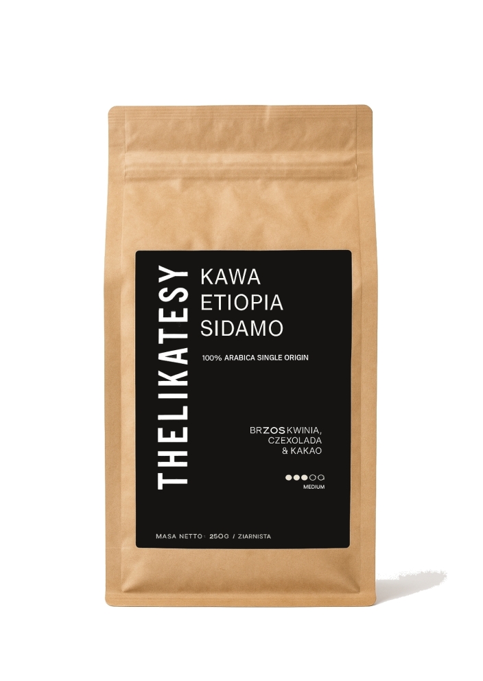 Pyszna kawa 100% Arabika Etiopia Sidamo naszej produkcji. Naturalna, palona, ziarnista. W smaku wyczuwalne są nuty czekolady, brzoskwini oraz kakao.