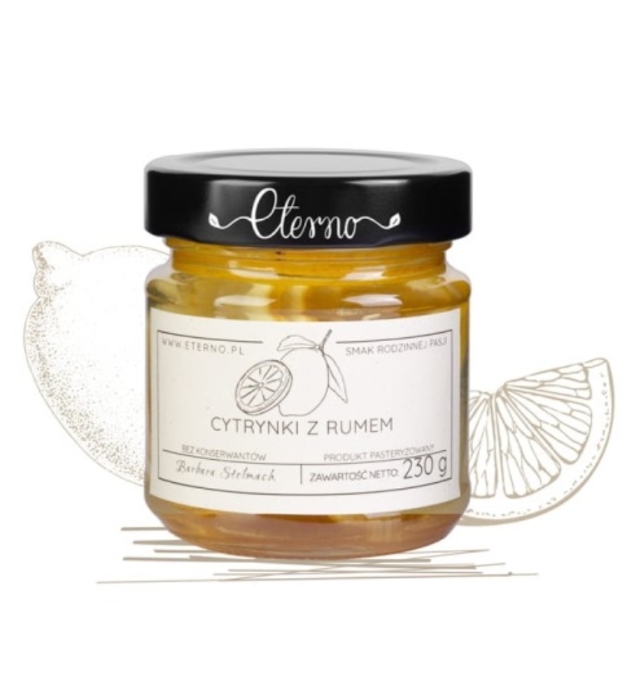 Cytrynki z rumem przygotowywane są z najlepszych cytryn, rumu i cukru bez odrobiny konserwantów. Nie są rozcieńczane wodą. Bardzo dobrze sprawdzą się z gorącą herbatą, a w gorące dni jako dodatek do lemoniady czy drinków. Można je również wykorzystać do deserów jak i ciast. Opakowanie 230g