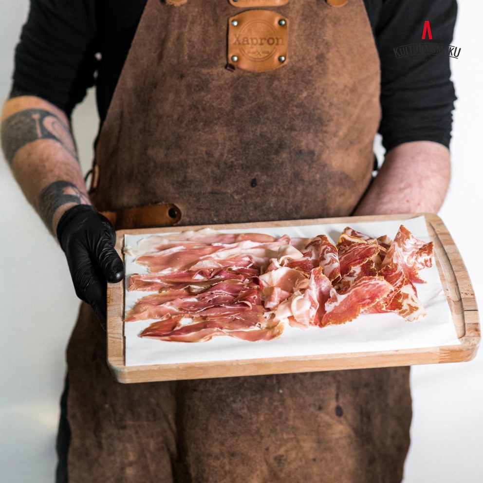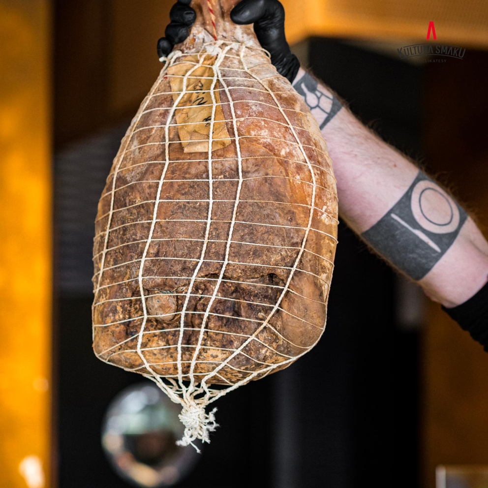 Szynka noga dojrzewająca w stylu włoskim Rzeźnika Kultury Smaku. Dojrzewa min. 16 miesięcy, podwędzana dymem bukowym. Opakowanie 100g ( krojona) Skład: mięso wieprzowe, sól, cukier, bakterie fermentacji mlekowej, sól peklująca < 0,1%