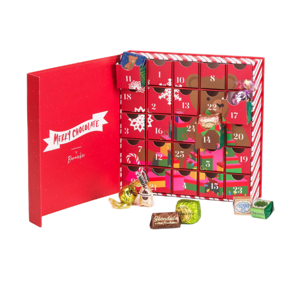 Kalendarz zawiera różnorodne smaki, w tym praliny, trufle i czekoladki mleczne, gorzkie oraz z orzechami. To idealny prezent dla miłośników czekolady, dodający trochę luksusu do codziennego odliczania do Świąt Bożego Narodzenia.